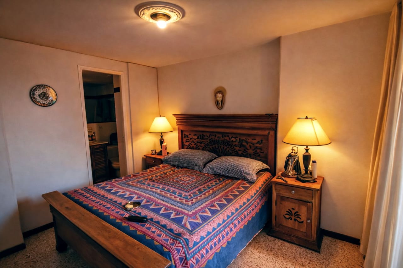 La habitación principal se destaca por su balcón privado y baño con ducha, creando un espacio íntimo y confortable.